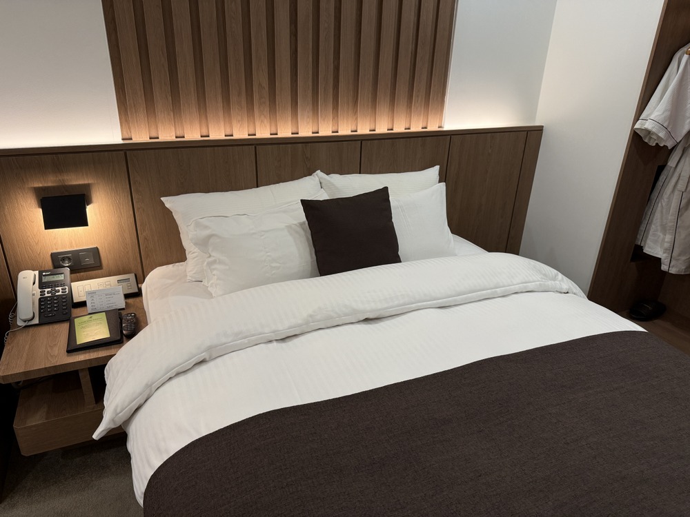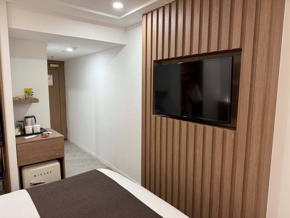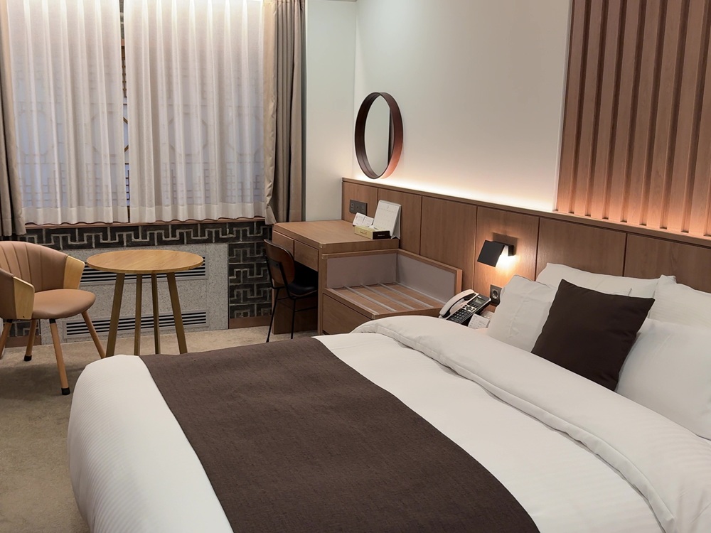 今回はプレミアスタンダードダブルルームに宿泊しました。パブリックスペースのコテコテなデザインとは打って変わって客室内はシンプルで落ち着いた内装です。18㎡とやや狭いですが、最新の設備に改装されており快適に過ごすことができます。