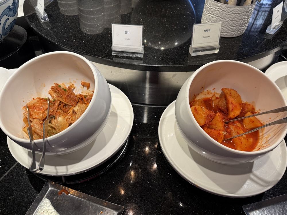 韓国と言えばキムチ。普通の白菜キムチと大根キムチ(ソッバクチ)が並びます。