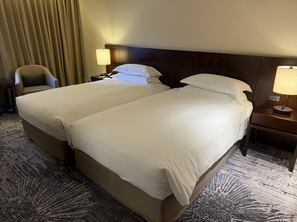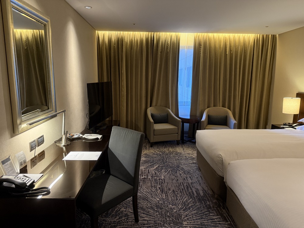 今回はツインルームに宿泊しました。客室は落ち着いたデザインで旅の疲れをゆっくりと癒すことができます。