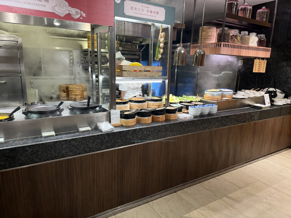 それでは最初にオープンキッチンに並ぶメインの温製料理を見てみます。まずは中華系の料理から。