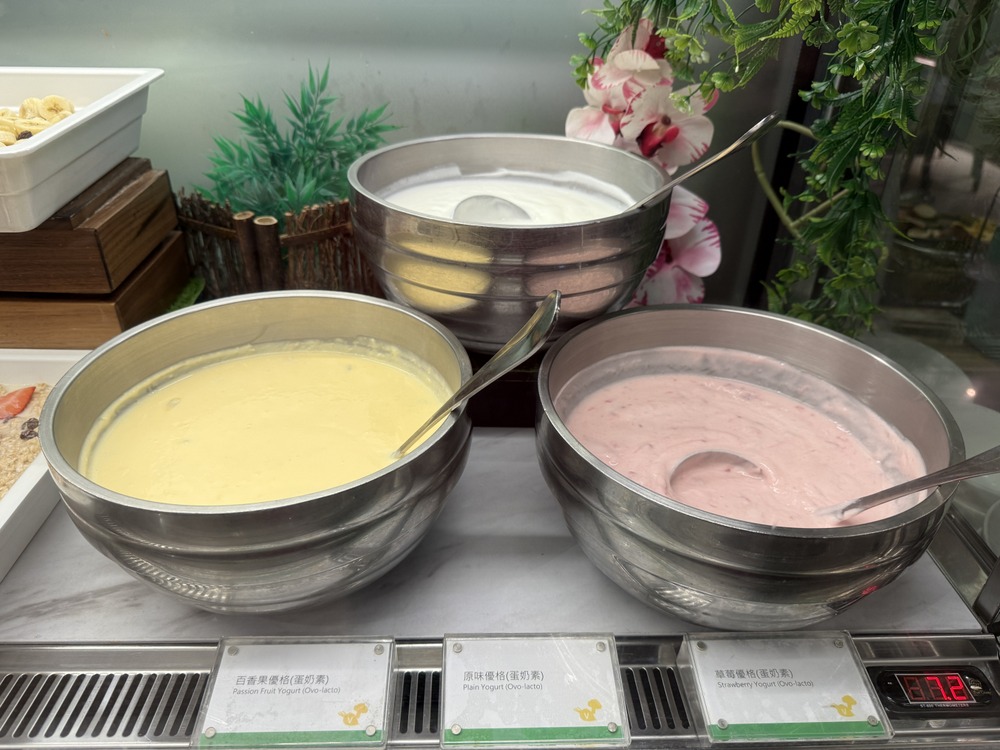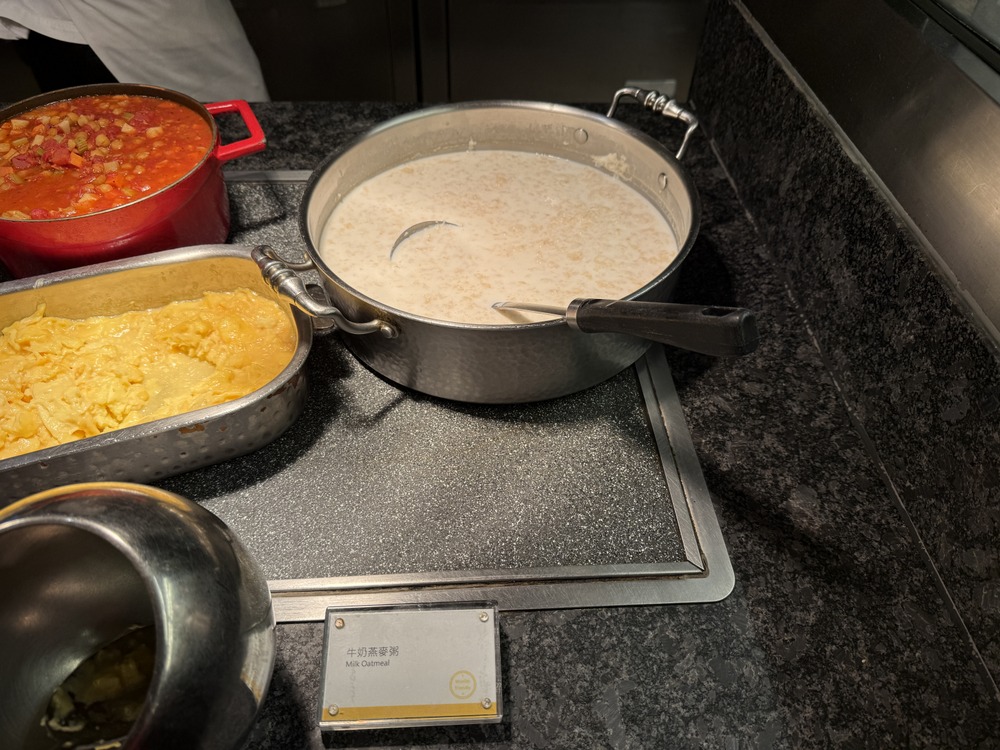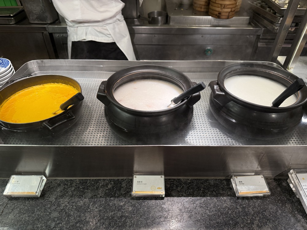 スープとお粥のコーナー。左からパンプキンスープ、海鮮粥、プレーン粥です。