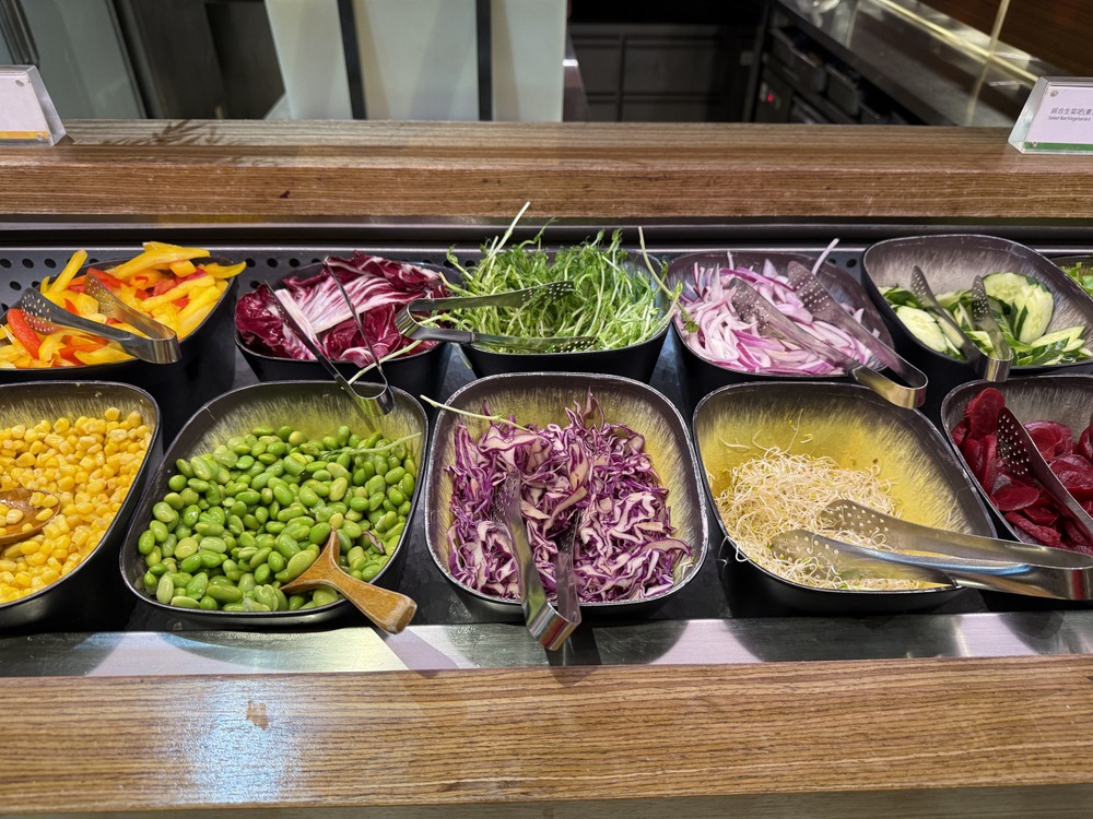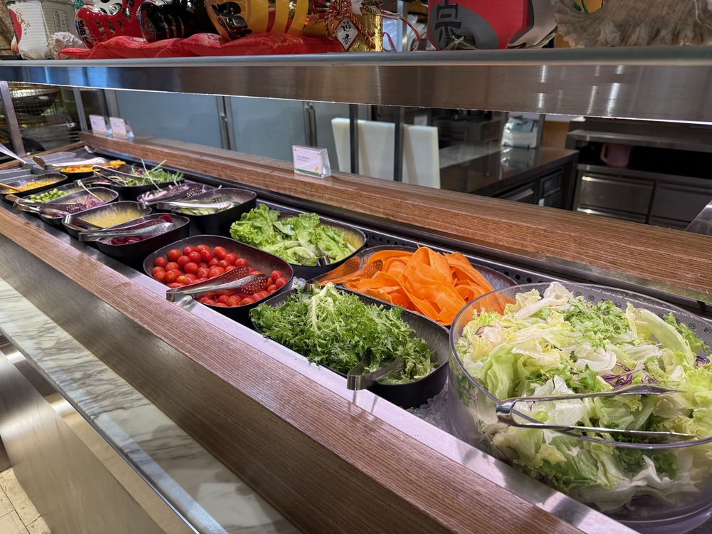 サラダのコーナーです。新鮮な野菜がずらりと並んでいます。