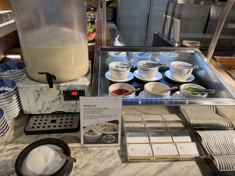 こちらは台湾の伝統的な豆乳料理「鹹豆漿(シェントウジャン)」です。豆乳に酢や醤油などを加え、お好みで具材をトッピングして頂きます。台湾ならではの朝食メニューです。